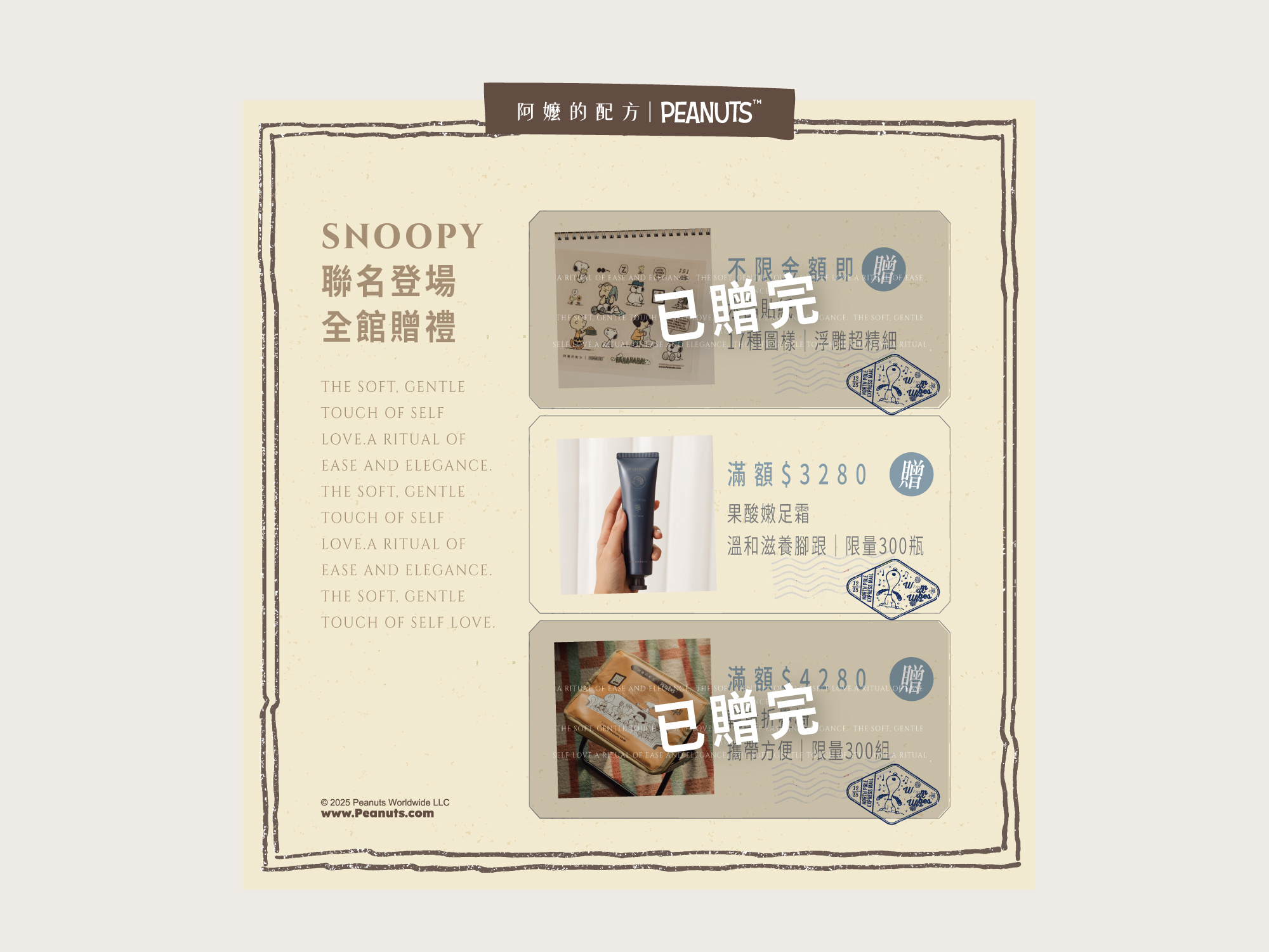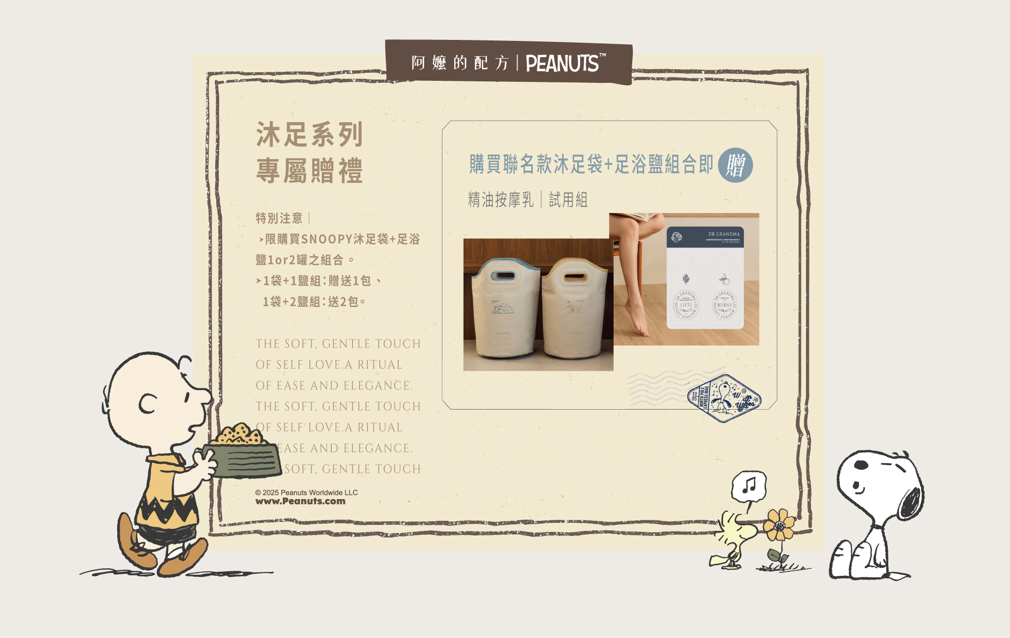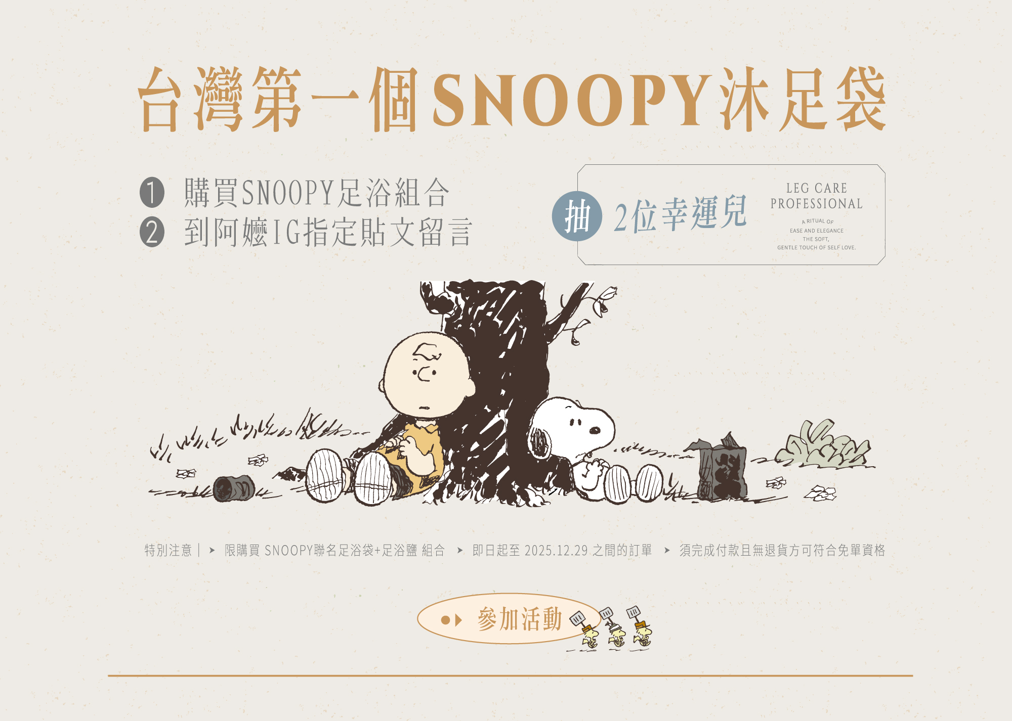 - 訂單編號成立時間:2025/12/2 12:00 ~ 2025/12/29 23:59 (僅限阿嬤的配方官網成立之訂單),且訂單中需包含至少一組「SNOOPY聯名款沐足袋的組合商品」