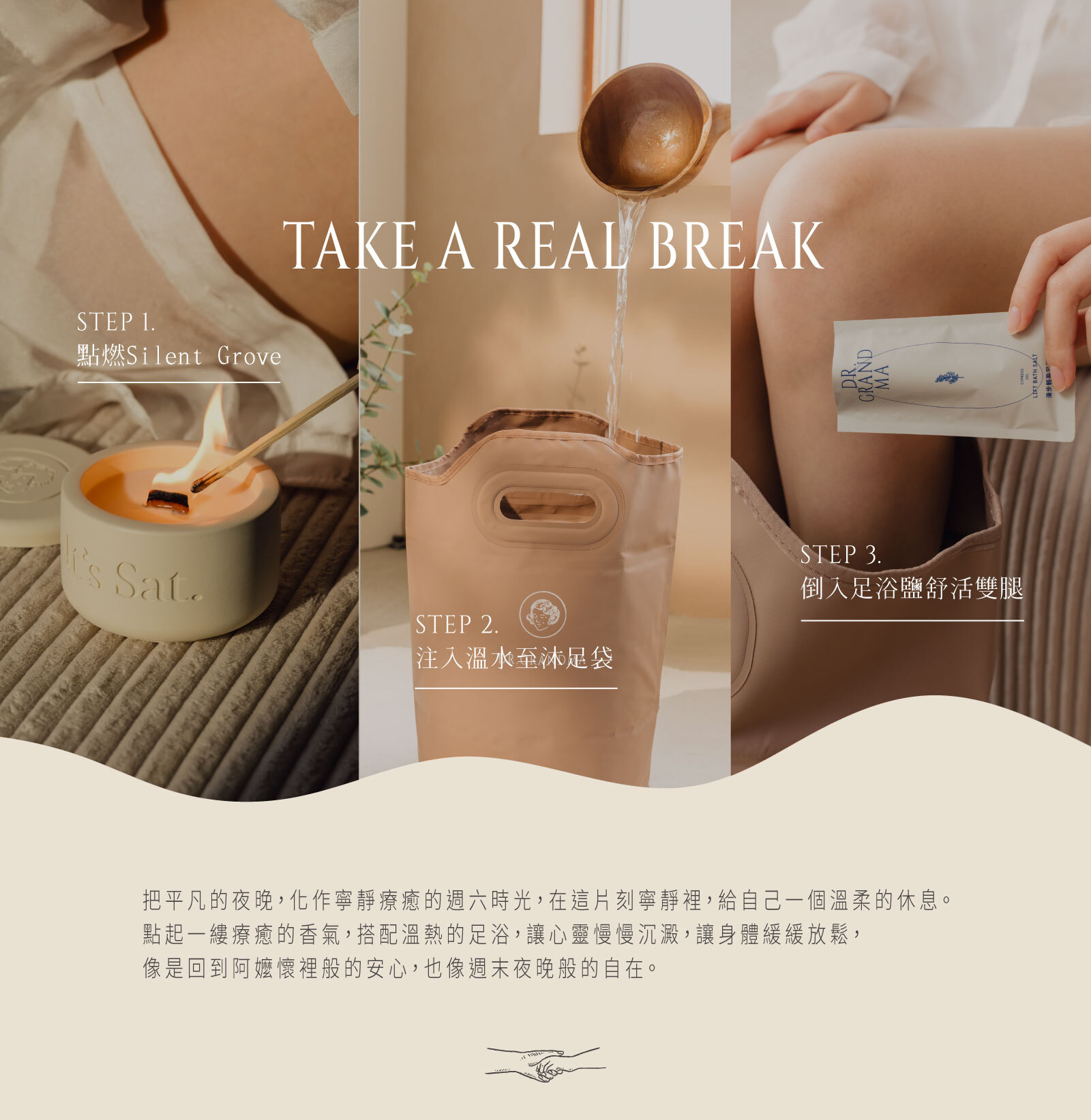 組合內容:Silent Grove 香氛蠟燭1個(65g)+妳的・桑拿沐足袋 (附有足底按摩板) 1入+ 精油足浴鹽 (20g/包) 任選2包